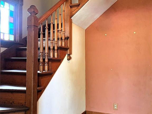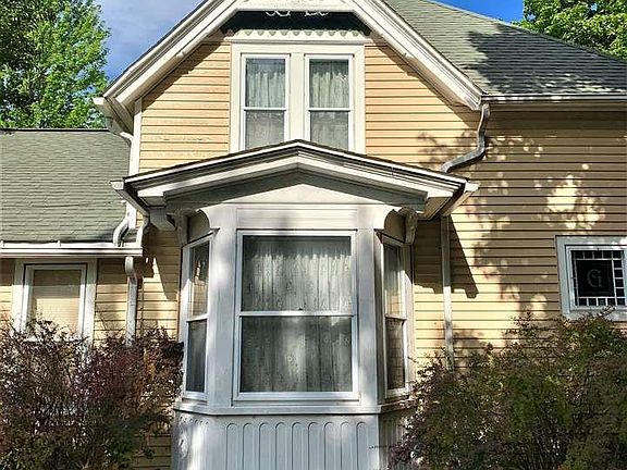 Farmhouse charm in the middle of town. This 4 bedroom, 1 bath, home with two stall garage has been kept in it's original splendor. With 8 inch trim, pockets doors, ornate hardware, glass door knobs, high ceilings, and stained glass windows. The vestibule entry features winding wood staircase, stained glass window and front door. Living room has gas fireplace, new carpet, stained glass window. Large dining room with antique chandelier. Eat in kitchen with original glass front cabinets. Large corner lot with mature trees.