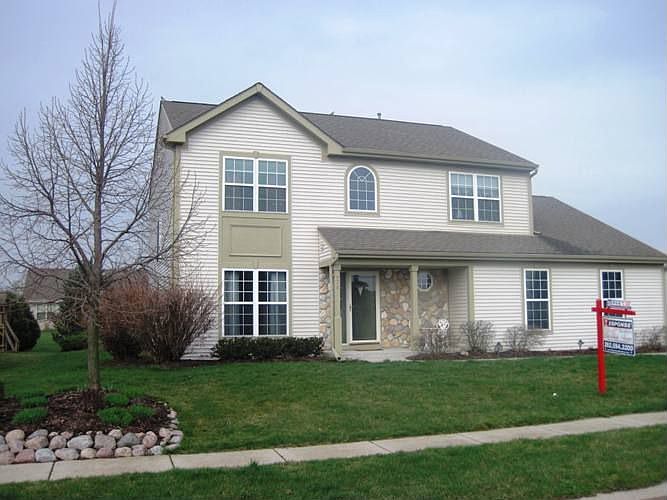 Immaculate 2325 Sq Ft, 4 BR, 2.5 BA colonial w/9?? ceilings. This home boasts; vinyl siding, custom stone front & cedar trim. The grand two-story entrance w/wood floor leads to the open concept main level. Eat-in KIT including breakfast bar & extended bay. GR features natural or gas FP. Relax on your patio overlooking the prof. landscaping designed for privacy. Large upper landing w/private MBRS, dbl vanity, glass shower and WIC. Other features incl 6 panel doors, open staircase and side drive entrance.