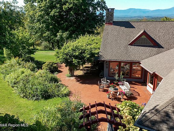 Nearly 30 secluded acres of rolling meadows and woodlands unfold into breathtaking panoramic views of the Catskill Mountains. This is a place to slow down and reconnect with what matters most. Reminiscent of the Adirondack Great Lodges, this home is a masterful blend of rustic elegance and timeless craftsmanship. Soaring, strap-and-beam ceilings create a dramatic sense of space, while a custom-crafted staircase and a floor-to-ceiling wood-burning stone fireplace add to the home's warmth and grandeur. Step from the main living area out onto the brick patio to take in sweeping sunset views over the mountains. The expansive dining room easily accommodates large gatherings, and features a cozy window seat ideal for lounging while soaking in the views. The chef's kitchen is both stylish and functional, featuring a beamed tin ceiling, tile flooring, and stone countertops that lend a timeless elegance. Just off the kitchen, step into your private outdoor oasis. This expansive patio features a pergola draped in mature, blooming wisteria. At the heart of the space is a fully equipped built-in barbecue station perfect for hosting al fresco dinners or weekend cookouts. A half bath, laundry room, and walk-in pantry offer added convenience, leading directly to the attached garage. The first-floor primary ensuite has westerly mountain vistas, direct access to its own private deck, and a secluded outdoor shower. Three additional bedrooms and a full bath provide ample space for family and guests. The second floor offers additional privacy and flexibility, featuring a second primary ensuite complete with a private balcony. Two more bedrooms with balconies, a full bath, and a cozy reading nook create a warm and welcoming retreat. The heated gunite pool and pool house, complete with a full bath and kitchen, are perfectly positioned to capture all-day sunlight while maintaining complete privacy. Tucked away for privacy, the Vermont Post and Beam barn adds both character and versatility to the property. Outfitted with electric and a full second-story loft, it features charming eaved windows that flood the space with natural light. This exceptional property exudes quiet rustic elegance, with spacious living areas, rolling lawns, and dramatic Catskill Mountain views. Located in the northeast area of Dutchess County with easy access to Red Hook, Rhinebeck, Pine Plains, Millbrook, Tivoli, Germantown, Hudson and more. Convenient to trains, Fisher Center, Bard College, private airports, excellent restaurants and farmers markets, it's a rare opportunity to embrace space, serenity, and timeless natural beauty in the heart of the Hudson Valley.