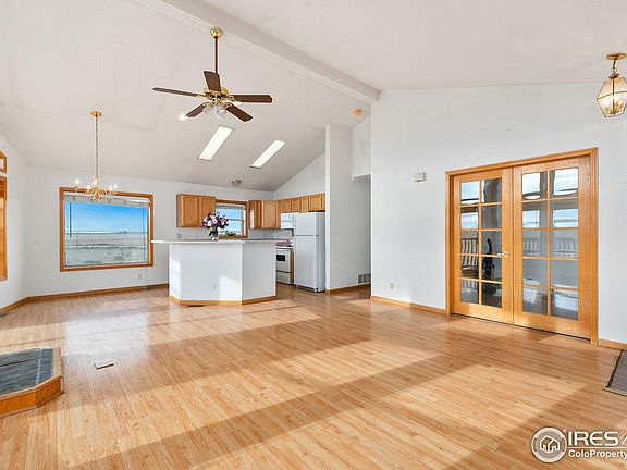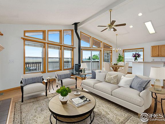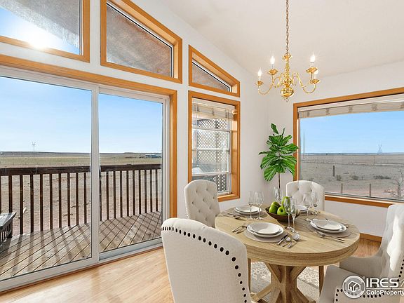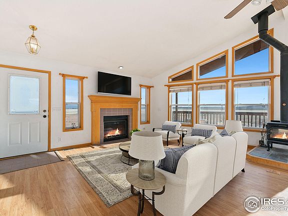 Beautiful log cabin style ranch home with sweeping views of the prairie and mountains and 5.39 acres of land zoned agricultural. Interior features include the incredible vaulted great room with windows from floor to ceiling and laminate wood floors that are contemporary and easy to clean. The open concept layout enjoys the warmth of a wood burning stove and a gas fireplace. Take in views of the sun setting over the mountains from the covered deck. Primary bedroom with vaulted ceiling, 5 piece bath with luxurious Jacuzzi soaking tub. In the unfinished basement you'll find a duct installed and ready for operating a pellet stove. Your hobby farm is set up with a chicken coop, 32x24 ft hay barn, garage or shop with dirt floor, and wire pasture fencing. High speed fiber optic internet is available! The furnace and AC are only a year old. Enjoy true freedom with no HOA, no covenants, and the right to farm.