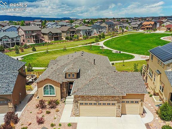 Welcome to this remarkably well-kept, ranch style home located in the desirable Academy School District 20 neighborhood of Wolf Ranch.This Palazzo floorplan built by Covington Homes is a one owner home with 5 beds, 4 baths, and a 3 car garage. Let the kids or grandkids play out front in the cul-de-sac or venture to Stonehaven Park with gate access from the backyard. Enjoy Pikes Peak views from your primary bedroom or from the homes balcony. Entertain in the formal dining area, or grab a quick meal at the island, or the breakfast nook. The entry welcomes you with natural hardwood floors throughout most of the main level. This is main level living to a "T," with a large laundry room, two oversized bedrooms and two bathrooms. The main level is complete with 8' doors, a dropzone off of the garage entrance, and multiple storage closets. Head downstairs for movie night in the basement or to roast marshmallows on the large concrete patio from the walk-out basement. The lower level provides 3 large bedrooms, and two full bathrooms with a huge living space and 9' ceiling height. Here's a quick recap: Ranch style home, D20, cul-de-sac, backs to a park, walk-out basement, AND mountain views! This checks every single box!