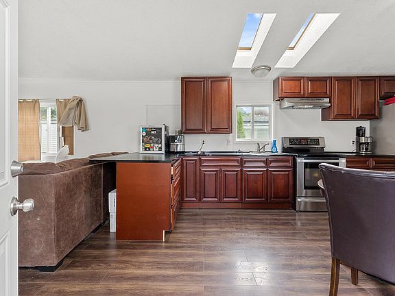 Green Acres mobile home park with it's own private lake access. This 2 bdrm 2 bathroom home has a great floor plan with bedrooms at both ends of the unit each with it's own washroom right there. The kitchen family/living room is in the centre of this home. This home has newer cabinets, countertops and flooring. Beautiful use of skylights in the vaulted ceiling of the kitchen bringing in natural light into the main living areas of the home. The primary bedroom has it's own private ensuite complete with an oversized soaker tub and a full walk in closet. The good sized yard is private, perfect for those with little ones. This park is family friendly.