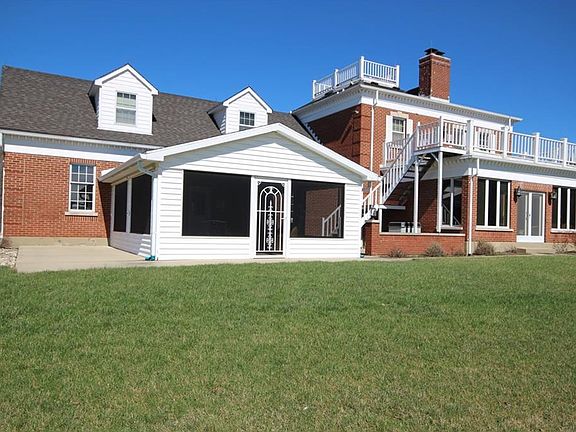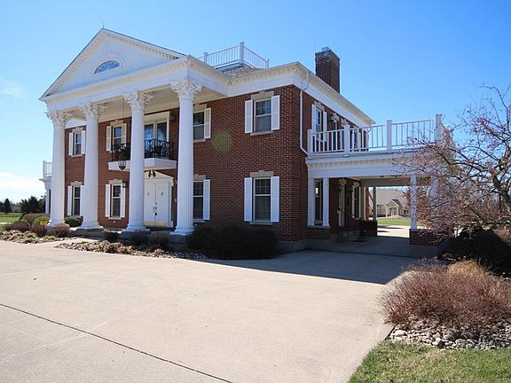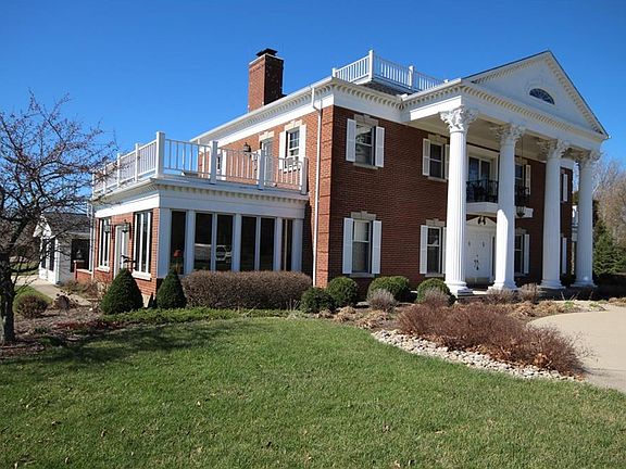 WOW! Charming four bedroom, three and a half bathroom brick home with Redwood trim. Over 5,500 square feet, located on nearly two acres with garage space for eight cars! Stunning Corinthian pillars, custom stained glass, cathedral ceilings, custom plaster ceiling medallions, and several balconies add to the appeal and charm of this beautiful property. Generously sized bedrooms. Updated master bathroom. Top of the line cherry Pella windows. Beautiful cherry cabinetry in large, open kitchen. Substantially sized all seasons room. Full, finished basement with unlimited potential.