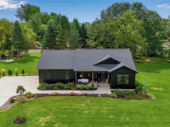MUST SEE!!! Spacious & remarkable newer-built ranch with designer luxury finishes beautifully set on 1.48 acres where privacy abounds with highly rated Akron schools. Featuring a high-end kitchen with custom 36” Hickory hardwood soft-close cabinetry with glass paneled doors, distinctive Quartz counters, white farmhouse sink opening to the expansive family room with vaulted ceilings, exposed barnboard beams for added character with recessed lighting and stunning luxury vinyl plank floors throughout. With an open layout concept & an abundance of natural light, this desirable home has the primary bedroom suite with bathrm dual vanity and LVT flooring on one side of the home with the two other bedrooms and full bath conveniently situated on the opposite for privacy and relaxing summer evenings. Beautifully appointed exterior is professionally manicured with a pond and covered front porch, perfect for sipping your morning coffee, and a serene backyard oasis complete with a covered concrete patio and outdoor wood boiler system that can be used in place of propane for heating. Live worry free with the on-demand Laars multi-zone water heater and in-floor radiant heating, 200 amp electrical, 1st floor laundry, forever metal siding & architectural shingles for years of peace and ease of living. Meticulously maintained & tastefully built, this charming home rests on a peaceful street with low taxes, great schools yet still close to the conveniences of the Village of Akron! Square footage is from owner and showings start Wednesday, 9/3/25.