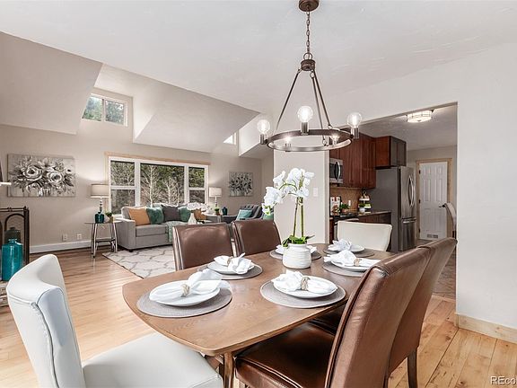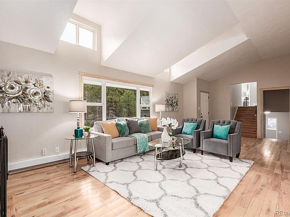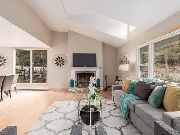 Welcome to your mountain retreat in the hills of Morrison! This beautiful home sits on 3.4 acres next to Turkey Creek and is perfect for your primary home or a weekend getaway. Featuring 4 bedrooms and 4 bathrooms, the home has recently been carefully updated throughout. Walking into your home, you immediately notice the wide plank wood floors, the dramatic vaulted ceilings and the large open floor plan living room area that is well lit with windows and a wood burning fireplace in the center of the room. Notice the large dining room area with a door to your backyard. The kitchen features granite slab counters, beautiful cabinets and new lighting fixtures with an eating nook and sliding glass door to the backyard and patio for those cool summer nights. Walking up to the next level, it features the Master Bedroom with French doors out to your private deck.