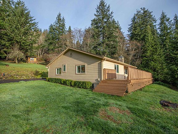 Lovely home with paved circular driveway and large deck, myrtlewood floors with cedar walls and ceilings in living areas. Engineered flooring in bedrooms and tile in bath and kitchen. Newer kitchen cabinets with granite counters and newer SS appliances. 24 x 24 detached garage, RV carport and standard carport plus a "guest cabin" with power and water. Fire pit, garden area, multiple fruit trees! Furnishings available for purchase separately.