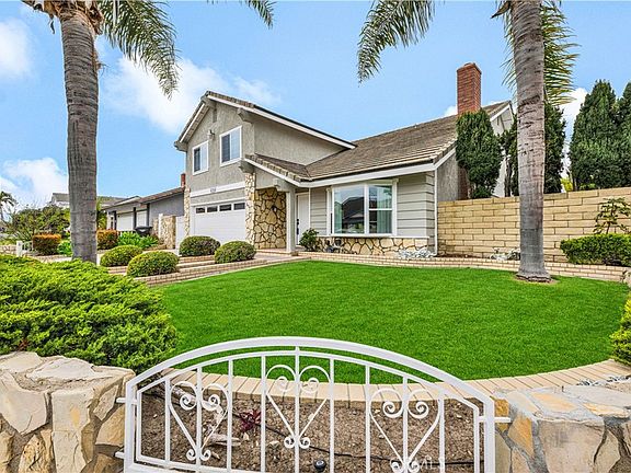 Just like a brand new custom-built home, this exquisite 4 bedroom, plus massive bonus room (optional 5th bedroom), 3.5 bath Parkside Estates Home offers 2,388 SF of luxurious living on an oversized 7400 SF lot. Every square inch has been masterfully upgraded, using the finest materials and craftsmanship with impeccable attention to detail throughout. Everything is New! This breathtaking residence features an open concept floorplan, central A/C, downstairs bedroom & bath, a finished epoxy garage, an amazing park-like backyard, all newer dual pane French windows & sliders, recessed lighting, new wood vinyl flooring, raised panel doors, designer paint, and more! Located on a cul-de-sac street, this home stands out from all the others with its captivating curb appeal showcasing custom hardscape of flagstone & stained concrete, professional tropical landscaping, new exterior paint, wood & flagstone siding, and concrete tile roof. Step through the custom front door w/2 sidelights to the showstopping elegant formal living room with soaring two-story ceiling, bay window, marble fireplace, adjacent formal dining room, and dramatic wrought iron staircase. The brand new chef's dream kitchen features coffered ceiling, Quartz countertops, glass mosaic tile backsplash, white shaker soft-closing cabinetry, an eat-in breakfast bar, and brand new stainless Frigidaire appliances. The kitchen flows seamlessly into the welcoming family room with wet bar & custom built-in glass display cabinet. All 3 bathrooms have been exquisitely upgraded with tile or marble wainscoting and surrounds, clear glass barn-door style enclosures, floating shelving, new vanities, and new designer fixtures. Upstairs double doors open to the luxurious primary suite with double-wide mirrored closets, dual sinks, and a sliding French door that leads to a long veranda balcony overlooking the gorgeous backyard. Two additional spacious bedrooms upstairs share a jack & jill bath, and the huge bonus room boasts a walk-around entertainer's wet bar, half bathroom, and storage closet. The backyard is made for entertaining with an extra long covered patio, raised planters, manicured landscaping, lush lawn, and extra wide side yards, one even includes an additional covered patio. this impressive home is in a great neighborhood, walking distance to Mile Square Park and neighborhood park. Close to award-winning schools, shopping, restaurants, and a short drive to beach.