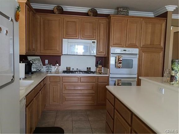 SINGLE STORY DELIGHT! Step into your formal living room with plantation shutters and you will feel right at home. Open kitchen with a cook top and double oven and family room with a dining area and a kitchen eating area too. Corner fireplace in the family room makes this home easy to be cozy in. Crown molding in living room, family room and kitchen. Indoor laundry with sink. Master bedroom has an additional slider out to the backyard. Master bath features a large walk in closet, dual sinks, soaking tub and separate shower. The second and third bedrooms have mirrored closets doors. Beautiful landscaped in the front and back yards and a 3 garage for all the family toys. Close to shopping and freeways, you can be to the low desert, high desert, mountains or the sea in no time. Whether you are a first time buyer, moving up or moving down check out this charmer.