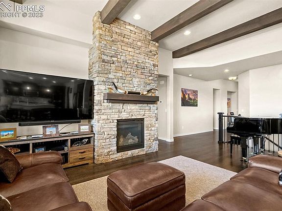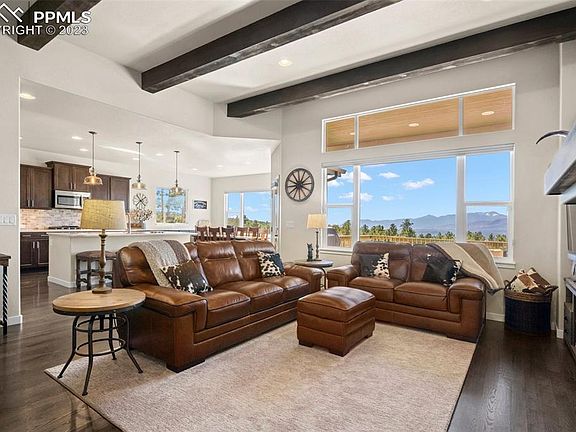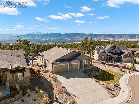 Welcome home to this immaculately maintained Ranch style home nestled on a quiet Sanctuary Pointe cul-de-sac with unbeatable panoramic mountain views from nearly every room. This stunning property shows pride of ownership and boasts a long list of upgraded finishes and thoughtful features. Walking in, you are greeted by a flood of natural light and real hardwood floors. The gourmet kitchen is equipped with a 5 burner gas range, double ovens, a tremendous island, an abundance of cabinetry including extended countertop space atop a built in buffet, a beautiful single basin sink and a spacious butler’s pantry. The living room is well appointed with a gas fireplace surrounded by tasteful stacked stone to the ceiling, wood fireplace mantel, wood ceiling beams and walkout access to the west facing covered composite deck. The primary suite is a dream featuring an adjoining bathroom with dual vanities, a soaking tub, step in shower, private water closet and walk-in closet. The main level also features a secondary bedroom, full bathroom, laundry room equipped with cabinetry and a utility sink and a convenient owners entry. Make your way down the wide, hardwood steps to the finished walkout basement and be welcomed by the expansive living room equipped with surround sound and wet bar rough in plumbing. The secondary suite features a massive bedroom, ensuite 3/4 bathroom and spacious walk in closet. Two additional bedrooms are on either side of a 3/4 bathroom. The large unfinished mechanical room provides a terrific amount of storage space. The finished 3 car oversized garage is an extended length of 27 feet. The professional landscaping is as immaculate as the interior of the home and is easily maintained with sprinklers. Don’t miss the unique water feature, fire pit and expansive poured concrete patio underneath the deck. Schedule your showing and be prepared to fall in love with everything this home has to offer!