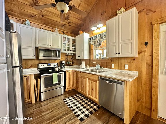 Robins Nest VBRO Property, Amish custom built, 1 bedroom, 1 bath, large open living area with kitchen and loft for extra sleeping area. Whirlpool appliances remain to include glass top range, refrigerator, microwave, and dishwasher. Washer and dry to remain will be white set from seller. Boat ramp only minutes from property, Lot 39 of Wilderness Road Development. Large wrap around porch on front and side of home. Great Lake place or investment property. Golf cart friendly community. Near Nolin Lake and State Park. Cave Hollow Bay Unit 3 lots 675,676 and wilderness subdivision lots 37,38,39,40,41 included.