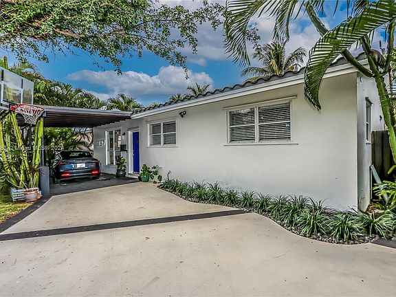 Exquisite three-bedroom, two-bathroom home just steps away from the Hollywood Beach Golf Club. Remodeled for optimum comfort, this home features a gourmet kitchen with high-end finishes, quartz countertops, and a large center island that doubles as a convenient breakfast bar. Large tile floors extend throughout the property. The carport includes an electrical outlet for electric cars. Additionally, there is an air-conditioned, insulated shed that can serve as an outdoor office or studio. The remodeled bathrooms exude modern elegance. A covered terrace offers an ideal spot for relaxation, surrounded by a fence that ensures privacy and serenity.