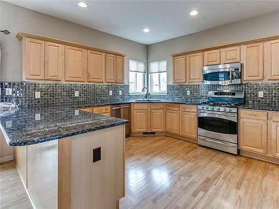 Wonderful 2 story home with an open concept. Main level features a formal dining room, kitchen has breakfast bar, cabinet space, granite counter tops, an easy flow into the living room with built ins. The upstairs features a beautiful master bedroom with a walk in closet, an en suite which includes a Jacuzzi, dual sinks and standing shower. 3 additional large bedrooms with 2nd floor laundry and full bath. Basement offers a fully enclosed Tile shower with dual shower heads, and includes a Sauna. An additional Bedroom is also in the basement. The spectacular basement living room offers a built in wine rack, wet bar, including a mini fridge, and a custom built entertainment center. Basement TV/Surround system with speakers and standing freezer in utility room are included. Can't beat the location with easy access to I-35. Shopping and golf amenities near by. Over 3300 sq ft. finished. Make it yours befores it is gone!
