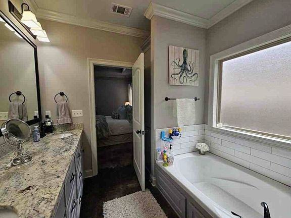 No carpet. Home has fenced yard and backs up to beautiful woods. Newer home with beautiful kitchen open to living room.