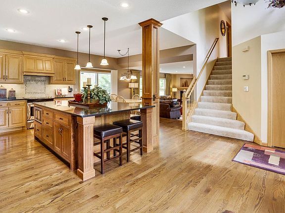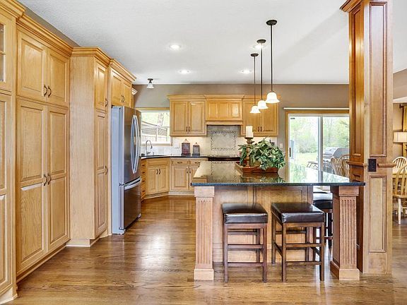 Fabulously updated 5 bed, 3.5 bath Savage home backs up to Eagle Creek DNR mgmt area for backyard privacy. Completely renovated kitchen includes custom designer cabinetry w/ pullouts, granite counters, tile backsplash, under cabinet lighting, new stainless steel appl, hardwood flrs & massive cherry center island that seats six. Living rm features stone FP w/ gas logs and built-in speakers. Main level bdrm is perfect for guests or as an office. Upper level includes private master suite w/ 2 additional bedrms & full bath. LL family room features custom cherry built-in bar, 5th bdrm, exercise rm and add'l storage in WIC and shelving in mechanical rm. In addition to backyard deck, there is a 28x14 pad behind the garage perfect for grilling, a basketball hoop or additional seating area. Bussing available for both Shakopee and Burnsville ISD in the neighborhood. Convenient to local shopping, restaurants, and Highway 169 for easy commuting.