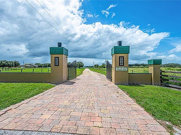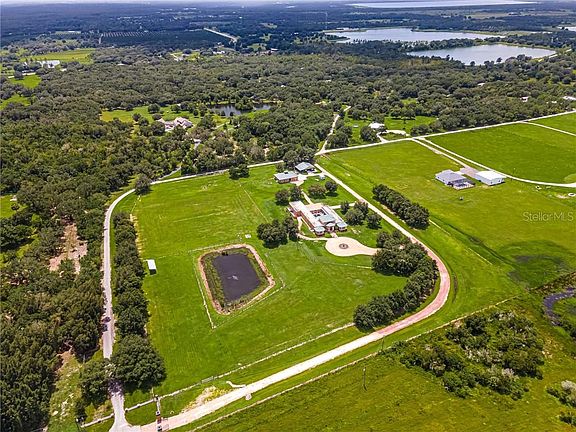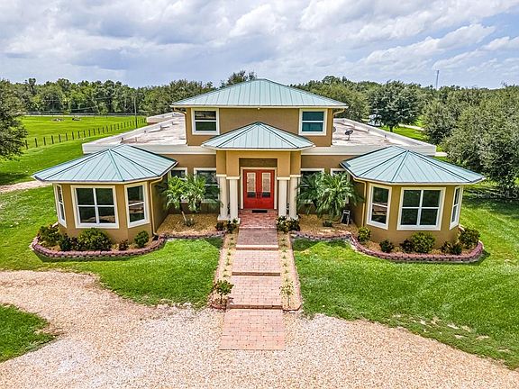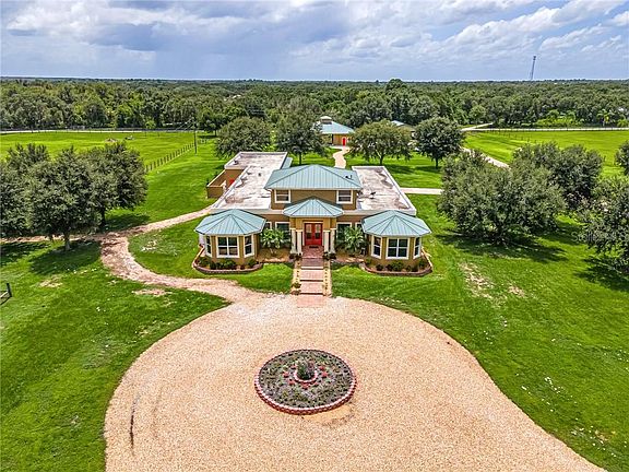 Wondering if you can have peaceful farm living and the beach? This Wonderful property gives you the peaceful and secluded farm life you always dreamed of and only about 40 minutes from gorgeous Florida Beaches. With over 10 acres of land this property is the perfect spot for horses to frolic, dogs to run, and children to play. Enter this 4 bedroom, 3 1/2 bath, 4 car garage home with 6699 sq ft Farmhouse to view a spacious living room with a view of the pool. A guest suite is to the left, then continue on to see the walk-in refrigerated wine room conveniently located by the entertainment bar. Your parties will flow nicely from the bar area into the cozy family room, dining area, and spacious Kitchen. The Kitchen features ample amounts of wood cabinetry, stainless steel appliances with double ovens, deep farm sink, and a wonderful prep island. The front living room also provides stairs to the flex space that will fit whatever your needs are, from a 4th bedroom, to a yoga studio or media room. There is a bathroom upstairs, as well as french doors to the balcony so you can survey the whole estate. Back downstairs and to the right, you pass Bedroom number 3 and enter the master bedroom of your dreams!! This massive space offers access to the terraced pool, lighted tray ceiling, plus his, hers, and more closet space. The Master bath has 2 sink vanities, a makeup vanity, double shower heads in the huge walk in shower, as well as His & Hers private commode rooms. The Master sitting room could also be your own library, office or craft room. Almost all rooms open to the gorgeous terraced pool in the center of the home. Covered and uncovered patio space gives you many choices to lounge, with the pool, spa and waterfall wall as the perfect backdrop. You and your guests can choose to swim some laps or lounge with jets and a drink in the main pool area, or hop in the spa for more relaxation. There's two barns for your horses. The first barn is block, has two 12x12 stalls, area to park your lawn mower or tractor, tack room with window a/c. And best of all is the barn apartment. The barn apartment has 1 bedroom, 1 bath and combination kitchen/living room. The second barn has 3 stalls, fenced area for the horses before going to the field. Additional room is unfinished, it has aloft and can be used for whatever you need. Only 8 minutes to I-75. THIS HOME IS A MUST SEE TO APPRECIATE!