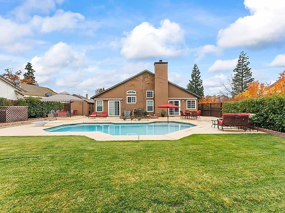RARE VAULTED CEILING SINGLE STORY DREAM HOME! PRICED AT THE NEW APPRAISAL, THE LARGEST SOLAR HEATED POOL WITH WATERFALL LOT AVAILABLE IN A YEARS! Delight in this elegant high end renovated turnkey masterpiece. Enjoy the only floor plan customized with a charming floor to ceiling brick fireplace, gleaming luxury vinyl plank wood floors in the prestigious gated Churchill/Vinyard enclave, rated the best of the Villages. Savor the Chef's delight kitchen featuring granite slab countertops, stainless steel designer appliances, gas cook top and gorgeous chic natural wood cabinets. The refined living room has cathedral ceilings, replacement sliding glass doors and windows to the captivating private yard w/a custom designed pool-scape featuring a soothing waterfall pool & lounge and entertain areas. The LUXE primary suite has vaulted ceilings, sliding glass doors out to the Resort like pool scape and gardens. The primary cathedral vaulted ensuite bath has tons of cabinets, beautiful countertops, double sinks, a luxurious oversized soaking oval tub and more. Gorgeous luxury vinyl plank and tile throughout. Enjoy the Workshop shed with double doors and power. It is like a mini ADU, matches the house perfectly. Also, for your boat or RV vehicles, enjoy the 25 foot by 40 foot gated RV parking, and the extra wide driveway that parks up to 4 cars. Regarding the new HVAC, it is 2025 state of the art. The best system money can buy, high performance and low cost Heat Pump system. You will also enjoy the huge electron patio covers over the main retreating doors and the Primary bedroom retreating doors. Your family will appreciate the award winning Elk Grove schools and aquatic center. Nextdoor Neighbors in Churchill Down rate their top interests as home improvement & DIY, crafts & sewing, gardening & landscape, walking, dogs, volunteering, travel, baking, biking & cycling, and cards & board games. The top reasons Nextdoor Neighbors love Churchill Down are: clean, community, diversity, friendly, neighbors, open, peaceful, walkability, walking, and well maintained.