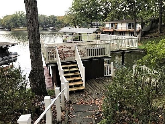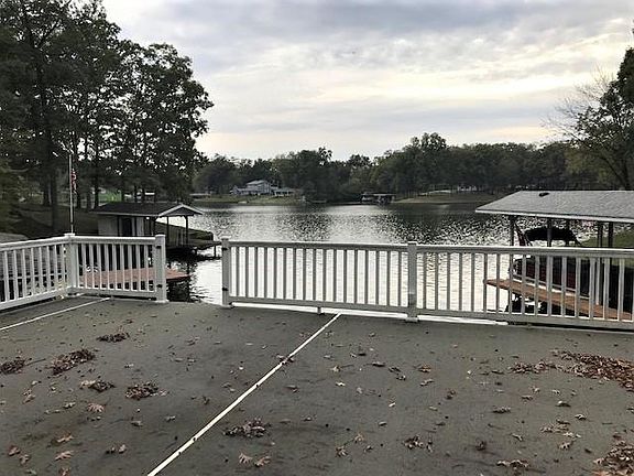Lake front property with dual slip boathouse and sundeck. Home has extensively remodeled interior including new master suite with private bath; new guest bath on main level; new Granite Island with snack bar; New Boos Butcher Block counter tops; New lighting; New carpet upstairs and hardwood on main level; New interior paint; New EDMP deck surface; New porch floor surface at lower level walkout; partial new roof; Deck Boards replaced at boathouse; etc. The Main Level is open from kitchen to living with lots of windows for great lake views. The lower level features a kitchen, bath, bedroom, and walks out to a nice covered and screened porch. The upstairs features 2 large bedrooms and a bath. Boat house has a storage room building, 2 slips with electric hoists, and a huge sundeck. Good view and water depth.