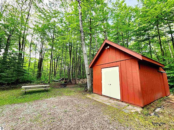 This charming home sits on a spacious one-acre lot, featuring a delightful master suite complete with a cozy sitting area, a private deck ideal for a hot tub, and an ensuite bathroom. Recently updated, this home exudes charm throughout. Nestled in a breathtaking wooded area, it also includes a shed capable of accommodating up to three snowmobiles or providing ample storage space. Additionally, there's plenty of room for a potential pole barn or garage. Enjoy the perks of the Lakes of the North community, which offers access to an indoor pool, water slide, lazy river, golf course, restaurant, beach houses on two lakes, and a pro shop.