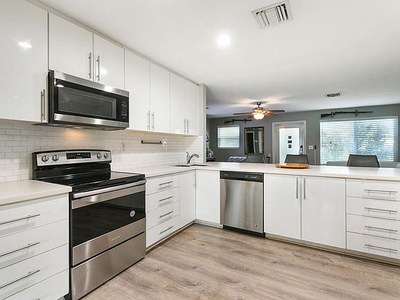 Enjoy comfortable living in this cozy home featuring a stylish kitchen with quartz counter tops & ample cabinetry, modern updated bathrooms, a large family/dining room, laminate flooring throughout, metal roof, impact windows and a newer a/c. Plus a separate laundry room, a covered, screened patio and the property is completely fenced. Third bedroom has no closet. No HOA. Ideally located in Palm Beach Gardens close to shopping, restaurants and freeways.