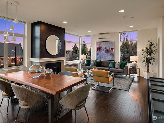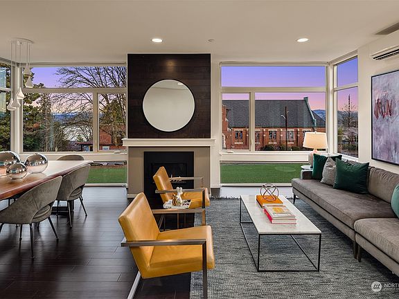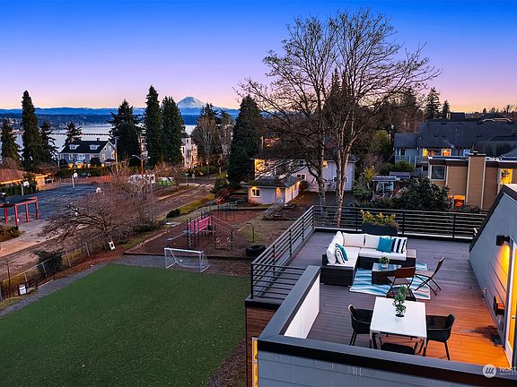 Stunning Madrona home showcases modern architecture spreading over four levels of indoor/outdoor living space. Open-concept main living level boasts richly hued flooring, custom metalwork, soaring ceilings + fireplace. Beautiful euro-style cabinets highlight sleek chef’s kitchen with high-end appliances, pantry + large island. Two bedrooms, bonus room, bath are found on lower level. Great set-up for home office w/ access to patio. Retreat in luxury to the primary suite on third level with its spa-like bath, private balcony + oversized walk-in closet. A rooftop deck with lake + mountain views make this home an entertainer’s paradise. Tree-lined neighborhood with adjacent park land. Dedicated parking space + close to refined dining, shopping.