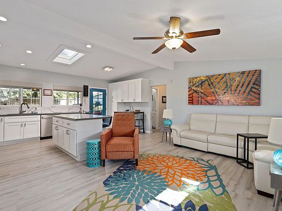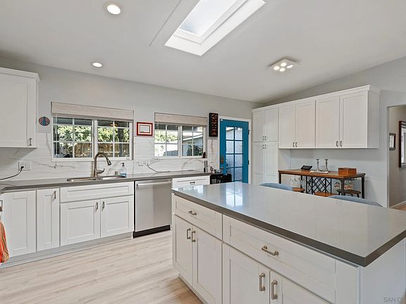 Panoramic views of Downtown, Coronado and twinkling city lights in the evenings will lure you to this remodeled beauty! Outdoor enjoyment abounds with a large deck that offers panoramic views, a hot tub, a covered patio for outdoor living or dining, a gated side yard with a warm, inviting courtyard feel plus a terraced backyard creates additional yard space for play, gardening or entertaining. The owned solar system maximizes energy efficiency. The remodeled kitchen is illuminated by recessed lighting and soft, natural light from a skylight, with an abundance of cabinet and counter space for all your culinary creation, stainless steel appliances plus an eat-at center island.