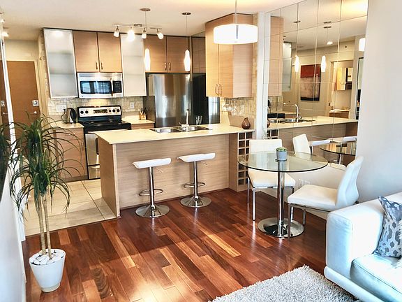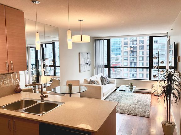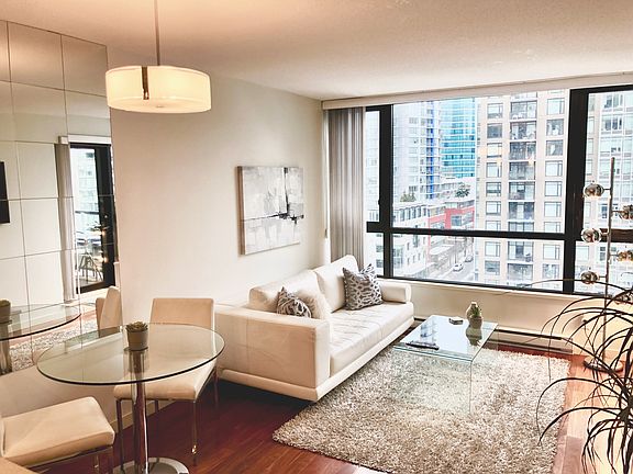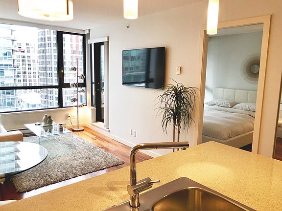 FURNISHED 1 BEDROOM, DEN, BATH, PATIO, PARKING, STORAGE, UTILITIES, VIEWS ABOUT Furnished High-speed Internet + WiFi are included in the rent Electricity, hydro and water included in rent Bedroom: 1 + Den/office + Custom Walk-in closet Bathroom: 1 Full Unit size: 656 sqft Flooring: Hardwood Outdoor: 1 Large covered Patio with table and chairs Parking: 1 secured underground parking stall Storage: 1 secured large storage unit FEATURES King size bed Walk-in closet In-suite laundry Modern kitchen with stainless steel appliances including range, microwave, dishwasher, fridge, garburator Includes bedroom linens and all kitchenware, utensils, cookware, and tableware Designer-decorated condo with Italian marble vanity countertops with peninsula-style kitchen bar open to dining & living room Hardwood floors Built-in wine rack Maple cabinetry with glass doors lit from within The smart spacious layout provides for use of every sqft Bright and open layout, lots of natural light Black-out blinds in the bedroom Smart flatscreen TV in the living room and flatscreen TV in the bedroom Access to Netflix, Prime, YouTube and much more Patio table and seating City views from the open over-sized covered balcony Furniture including dining table with chairs, bar stools, living room with high-end Italian white leather sofa BUILDING AMENITIES Fully Equipped Fitness Center On-site 24 hr Concierge and Resident Manager Key fob entry & High speed elevators Party/Media room Lounge and Games Room Playground and Courtyard Library Garden Visitor Parking Secure Underground Bike Room Guest Suite LOCATION This suite is located at the Heart of Downtown Vancouver within walking distance of a variety of award-winning Yaletown restaurants, the Seawall, cafes, libraries, theatres, sports venues, transit options, Skytrain station and much more! This complex surrounds an urban public park and is close to Robson Street, famous for Vancouver's best shopping, dining, and entertainment. Utilities included in the rent including, electricity, hydro, cold/hot water, high-speed internet and WiFi. No smoking. References and credit check.