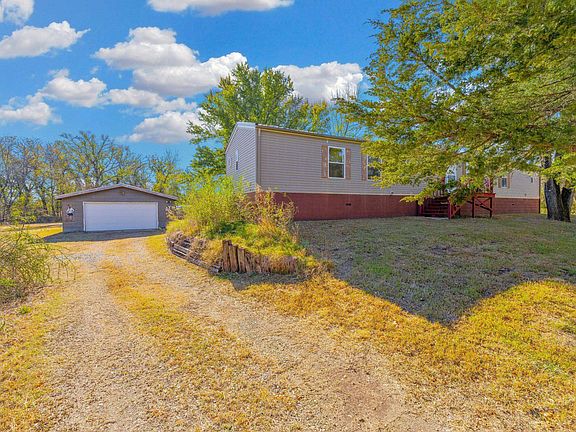 Escape to your own piece of country paradise on this serene two-acre lot near the Ninnescah River! Tucked away in a quiet neighborhood, yet close to Belle Plaine and Kansas Star Casino, and just a short drive to Wichita, Wellington, and Winfield, this property offers the best of both worlds. This solid, all-electric manufactured home sits proudly on a permanent foundation, featuring a spacious split bedroom layout with a huge living room separating the bedrooms, each equipped with large closets. The primary suite is a highlight, with its own bathroom complete with a garden tub and a separate shower. Imagine sipping your morning coffee on the enclosed back porch, watching the sunrise as local wildlife greets your day. The property is thoughtfully designed for accessibility with a ramp to the back door, while the front entry features a welcoming deck with wide steps. Outside, an oversized two-car garage provides room for workbenches, storage, and more, while two Quonset-style metal storage buildings offer perfect spaces for yard tools, ATVs, or even a small fishing boat. Additional features include a fenced dog run and garden area, a well house (with a new pump), and an above-ground concrete storm shelter—providing both convenience and peace of mind. This property is a perfect match for those seeking a tranquil, spacious retreat with easy access to city amenities. Don’t miss out—schedule your private tour today and step into the country lifestyle you’ve been dreaming of!