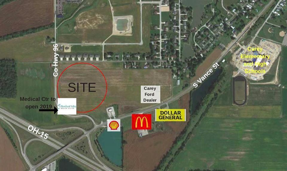 3 total parcels (928 Sheriden Dr, 925 Sheriden Dr, 923 Sheriden Dr) equaling +/-14 acres. Zoning allows for a wide variety of commercial uses including hotel, retail, restaurant, and office. Property has storm, sanitary, electric, gas, water, all available at newly installed streets. New street lighting and curbs. Existing retention pond in place to service all acreage. New 16,000 medical center to open first quarter 2019. Casey's General Store to open late 2019. Visible from OH-23 and OH-15. Potential for tax incentives and abatements. Village of Carey has a community reinvestment area which can offer real property tax incentives on commercial development. Maximum agreement can be up to 100% abatement for 15 years.