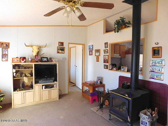 Quick access from I-40 you will enjoy the views from this 3 bed 2 bath m.f. home on 36 acres. The area around the home is fenced and inside the fencing you will find 2 ample sized connex boxes with a covered carport between them. There is a separate storage shed for the 12 heavy duty batteries that also have a winder generator for backup, to power the 10 solar panels. The water cistern is 2500 gallons and SVR provides the wells in the area where you can draw up to 4000 gallons of water per month for free. The living room and kitchen have a pass through opening making you feel like you are in a great room. There is also a wood burning stove as well as the forced air gas furnace. The home is a split floor plan with the master bedroom and bath on one eide giving you more privacy.