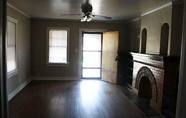 2 bedroom 1 bathroom duplex for rent. Large living room and dining room area. Fireplace with built in bookshelves on each side. Hallway linen closet. Nice newer kitchen cabinetry. Hardwood floors. Washer /dryer hookups. Open yard.