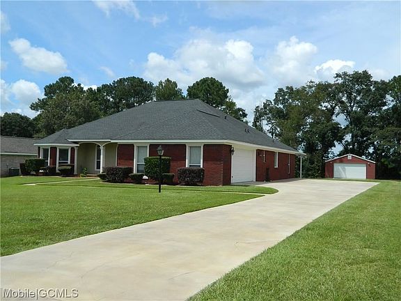 Welcome to Autumn Leaf Estates, a highly sought-after, established subdivision in West Mobile. Great location, convenient to Schools, shopping, New Publix, Mobile Swim club, the Airport, and so much more. Now to be amazed: this wonderful home sits on a level lot, just shy of ¾ of an acre, sprinkler system front & side yard. Pull in on the large nicely scored concrete driveway, plenty of parking here, notice the side entrance garage, plus an additional 24x28 detached garage/workshop wired with 100 amp service. Notice the curb appeal as you walk up to the covered front porch. Low maintenance, brick with vinyl eaves. Let's go inside and check out the unique floor plan. Large foyer with formal living on one side, perfect for a home office. A formal dining room on the other side. Enjoy the large family room with a trey ceiling, gas log fireplace, and open to kitchen dining area plus a raised breakfast bar. Plenty of granite counter space, island and cabinets, walk in pantry, and a 5 burner gas stove. Just off the kitchen is the master suite, offers French doors to the sunroom, glamour bathroom, separate shower with bench, garden whirlpool tub with sprayer, dual sink vanity, and a large walk in closet. A hallway with two nice size bedrooms and a full bathroom with a linen closet. Then off the other corner of family room is a pocket door to another bedroom, plus a half bath; this area has access to the sunroom. You will enjoy the large sunroom, it has it's on own HVAC and wired for a generator; surround sound, and yes a Hot Tub that seats 8 people. On either side of the sunroom, enjoy the covered patio with scored decorative concrete. One side has gas hook up for your grill. This wonderful home has so much to offer, I'm sure I left something out, interior walls have been freshly painted, attention to detail, archways, molding, trim work, porcelain tile looks like wood flooring, framed out windows, decorative recessed light covers..... Sure hope we covered everything on your wish list? Seller is providing a home warranty with spa coverage. Schedule to see this home, ready for immediate occupancy!