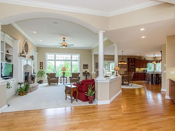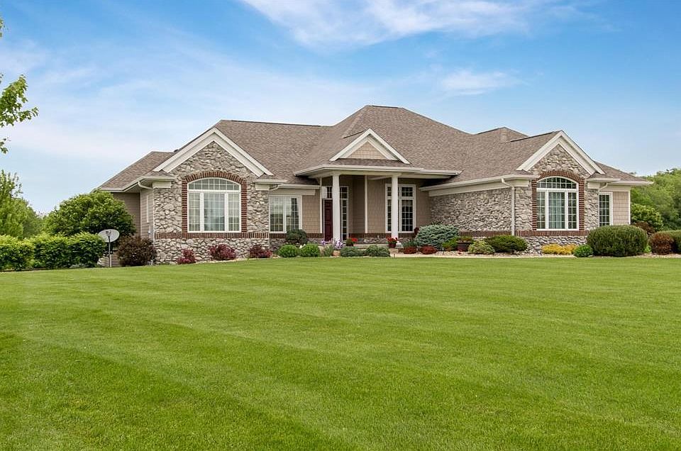 Enjoy picturesque views like a Grant Wood painting from this beautiful custom home on 6.27 acres overlooking a 5 acre, 25 ft deep stocked pond! Built by Deutmeyer Construction, all exterior walls are 2 x 6 construction. Brick, stone & cement board exterior. Geothermal heating for ultimate efficiency. Eleven ft ceilings in grand entry open into great room with tray ceiling, crown molding, custom built-ins & gas fireplace. Custom kitchen features Dura Supreme Designer solid cherry cabinets plus customized pull-out storage features & Butler's pantry. Main floor office with coffered wainscoating & beautiful glass door. Four seasons sunroom with vaulted ceiling, windows on 3 sides plus glass pocket doors. Amazing views from spa-like master suite with double doors into the master bath. Spacious 1st floor laundry with abundance of storage & wash sink. Guest bedroom & bath on main floor with 3 add bedrooms & 2 baths in the LL. Spacious family room with wal