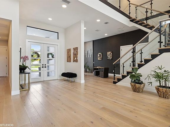 Luxury living in the highly sought-after Boca Bridges Veneto contemporary model. 2-story house with the primary bedroom down floorplan, 5 bedrooms and 5 full + 2 half bath, media room, loft, art studio with storage, den-game room and office. The home boasts 2-story ceilings in the living room and family room with contemporary wood details complimenting the glass stair rail. Huge 1st floor primary bedroom includes walk-in closets and bathroom with freestanding tub and separate shower. Beautifully done kitchen with 2 oversized islands and kitchen window, featuring Wolf, Sub Zero appliances. Contemporary pool with gorgeous marble deck overlooking the lake and lushes landscaping gives you a privacy. Marble pavers on the driveway add a touch of luxury to the exterior. Cul-de-sac street.