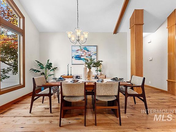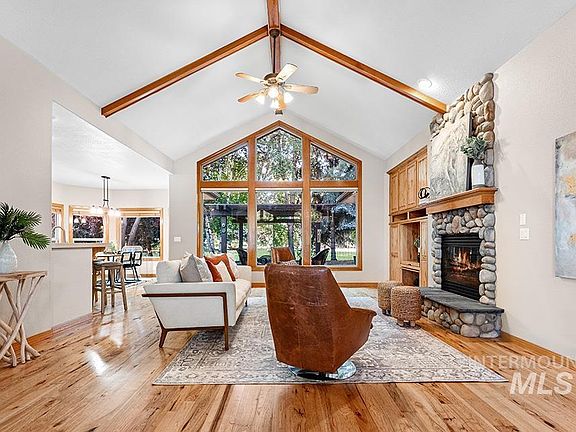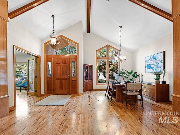 An enchanting garden sanctuary, nestled behind the gate in NW Boise's hidden gem community, Riverside Village. This stunning single level design provides a desired layout for easy living without compromising in space or privacy. Lush ~.43 acre grounds cradle the residence with verdant beauty, comprised of evergreens and deciduous trees. Striking angled roof lines are reminiscent of mountain design, further integrating the home into its spectacular homesite. Inside, an inspiring beamed cathedral ceiling crowns an expansive great room, with a wall of angled windows perfectly framing the serene backyard views. Knotty wood floors echo the rich stained trimwork that is abundant throughout, connecting the interior with nature. A seamless flow between living and gathering spaces makes everyday entertaining a breeze. The gourmet kitchen is fitted with generous cabinetry storage, a touchless faucet, stainless steel appliances, a raised breakfast bar, an island, and a walk-in pantry.