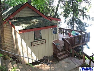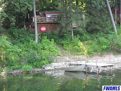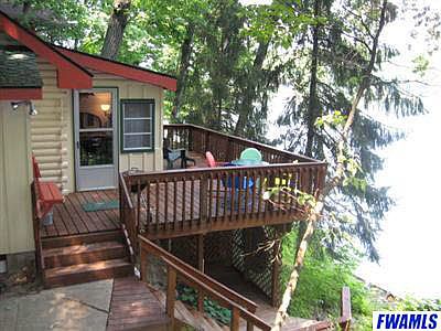 This adorable, rustic log cabin is a private hideaway that offers access to Tri-county Fish and Game Area at back of property! Quaint cottage features include hardwood floors, log interior, wood beamed cathedral ceiling and retro appliances. Cabin is nestled in a totally wooded, 72' field stone seawall lakefront, quarter acre lot; requiring very little maintenance. The beach is sandy, solid and gradual on a pristine 179 acre private lake. New hand railed boardwalk, steps, decking and under deck storage along with ample parking and storage shed complete this package. NOTE: Most furnishings and boat negotiable.Electric box cover, exterior soffets with venting and crawlspace skirting to be completed before closing.