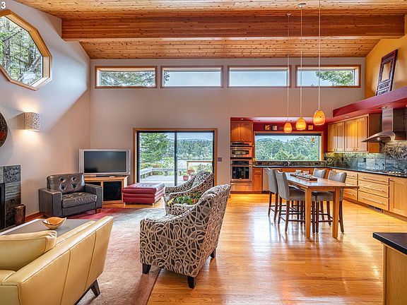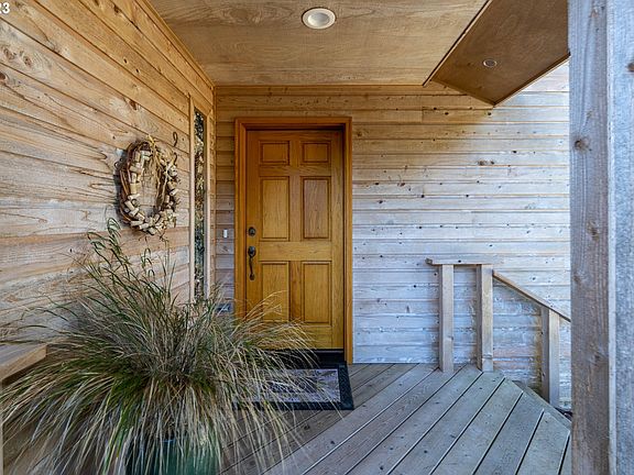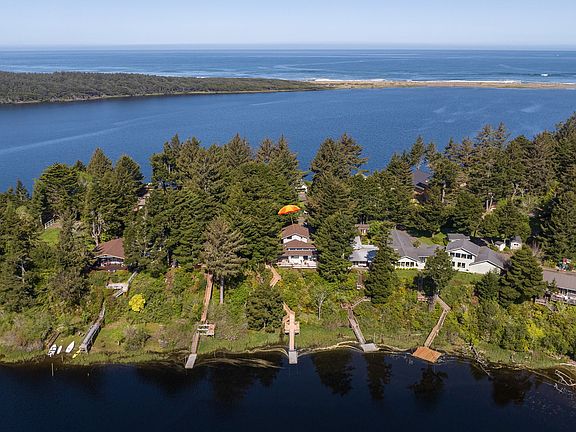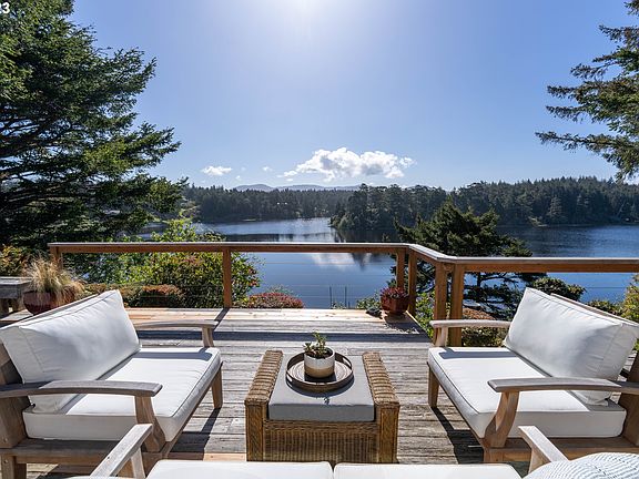 Waterfront artisan home on Floras Lake. Easterly morning sunrises, sun soaked deck and private dock. Lake view from every room. Featuring covered front porch, vaulted great room with knotty-pine ceilings, gas fireplace, oak hardwood floors throughout main and upstairs. Kitchen features gas range with hood, all stainless steel appliances, slab honed black granite counters and slate accents. Coffee bar features wine refrigerator, sink and built-ins. Primary En-Suite has the grander of the up-stairs, vaulted knotty-pine ceiling, wall of windows, art deco gas fireplace, double vanity, walk-in tiled shower, walk-in closet and unique office nook. A bit of an ocean view. Backyard with deck perched for a bird's eye view of Floras Lake. Complete with hot tub and outdoor hot water shower. Lakefront with private dock. Water activities and beyond, kayak, SUP, kite, wing, windsurf, fish, jet ski, hike, walk to the beach and explore Blacklock Point & Floras Lake trails. Located on the peninsula at Floras Lake, year round adventure, just 20 minutes south of Bandon by the Sea and 25 minutes south of Bandon Dunes Golf Resort.