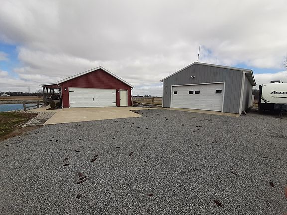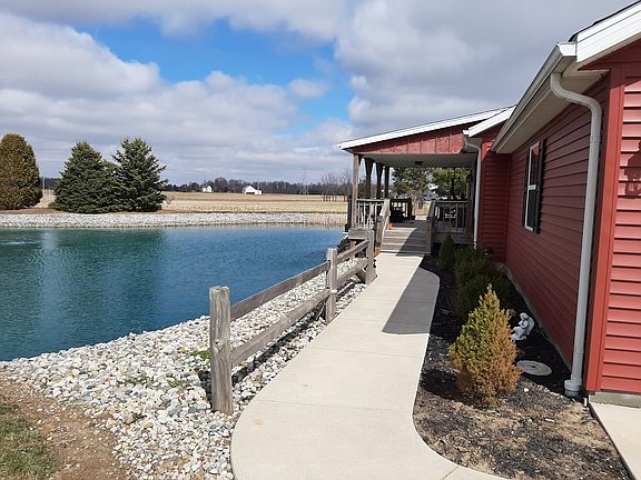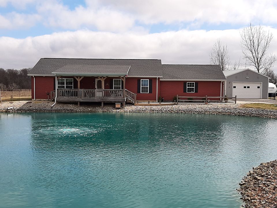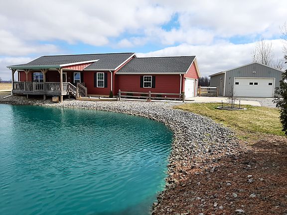 Start your life in the country in this 6 year old, 3 bedroom, 2 bath efficient ranch. This home features the following amenities: Open floor plan with split bedroom design. Master bedroom with large walk-in closet. Master bath with walk-in shower, double sink, and generous storage. Solid hickory cabinets throughout the home. 2nd full bath and utility room is conveniently located just off the large 2 car attached garage. Complete water treatment system including reverse osmosis drinking water at the kitchen sink. Kitchen has plenty of cabinets and counter/prep area with a bar to seat 3 - 4 people. 12x24 covered front porch overlooking a ¼ acre pond to enjoy those relaxing evenings watching the sunset. Fenced in backyard. 36x24 pole barn with a built in chicken coop. The home is heated and cooled by a heatpump. Newer matching Samsung kitchen appliances (black stainless) will stay with the home including: french door fridge, convection stove, dishwasher and micro-hood valued at $3000.00. Also staying with the home: John Deere 318 tractor/mower with snowblower attachment in excellent condition valued at $2000.00. Adjacent to the pond is a fire pit with a large landscaped gathering area. There is also an unfinished, poured concrete, 16 x 28 partial basement with a 4' deep dry crawlspace. The foundation has the latest technology in a tiled system including both upper and lower tile with interior and exterior sump pumps. All downspouts are tied into the tile and are dispensed into the pond. The house is plumbed with reliable pex plumbing.