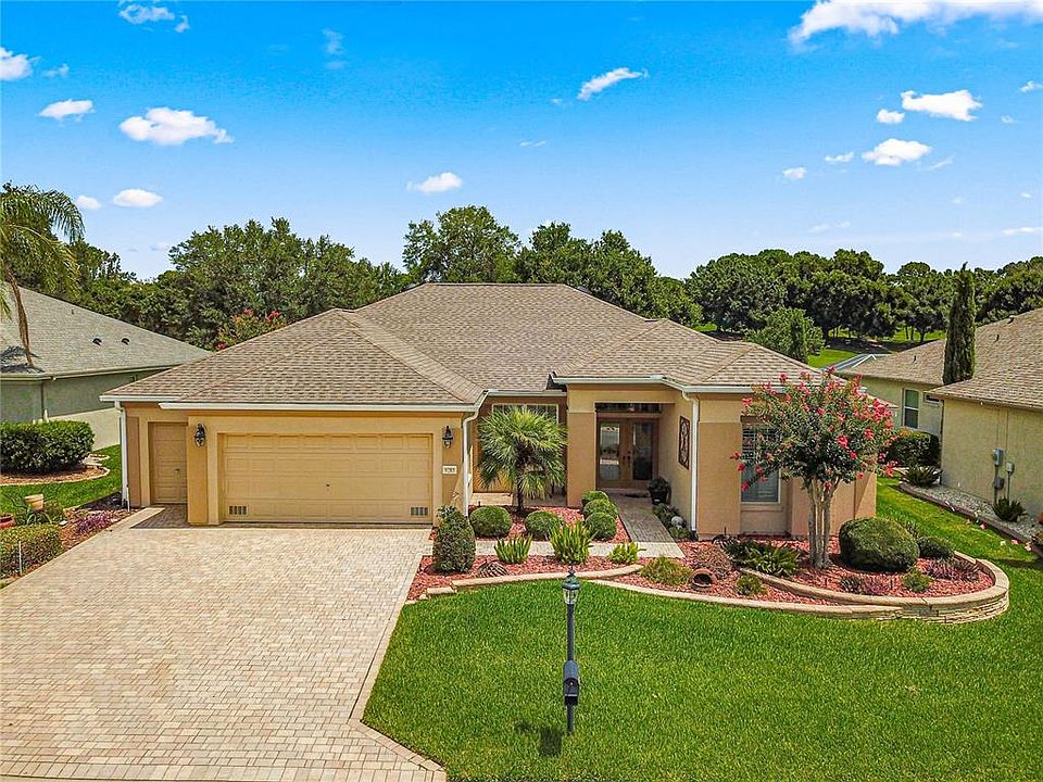 Welcome to your luxurious new home, ideally situated on the 4th Fairway of the prestigious Masters Course, in Del Webb Golf & Country Club. This elegant concrete block stucco residence boasts exceptional curb appeal with a dedicated golf cart garage, gutters and downspouts, charming hacienda walls for landscaping, and a stylish paver driveway and walkway. Step through the impressive double leaded glass entry doors into a grand open area featuring a foyer, formal dining room, and formal living room. The space is accentuated with crown molding, ceiling fans, and 18-inch tile laid on a diagonal, creating a sophisticated and welcoming atmosphere. The expansive kitchen is a chef's dream, equipped with a solar tube, maple cabinets, tile backsplash, Solid surface stone countertops, and newer stainless steel appliances, including brand-new refrigerator. The luxury vinyl flooring extends through the kitchen and into the adjoining grand family room, which boasts plantation shutters and a cozy eat-in breakfast nook, perfect for casual meals. Designed with a split floor plan, the master suite offers a serene retreat with luxury vinyl flooring, crown molding, and plantation shutters and massive walk-in closet, while the ensuite bathroom features a frameless shower door, soaking tub, and dual raised sinks, providing ample space and comfort. The guest wing offers generous accommodations, ideal for visitors or multigenerational living with 2 bedrooms and separate guest bath. Enjoy outdoor living at its finest with an enclosed lanai featuring full-view acrylic windows, overlooking an open patio perfect for grilling and entertaining, all with expansive views of the golf course. Additional highlights of this magnificent home include a roof re-shingled in 2021, a new HVAC system in 2024, a whole-house water softener, tankless water heater, and added solar tubes throughout for enhanced natural light. Discover the perfect blend of luxury and comfort in this stunning golf course home. Schedule your viewing today and experience the exceptional lifestyle this residence offers!