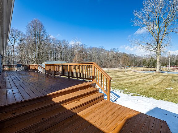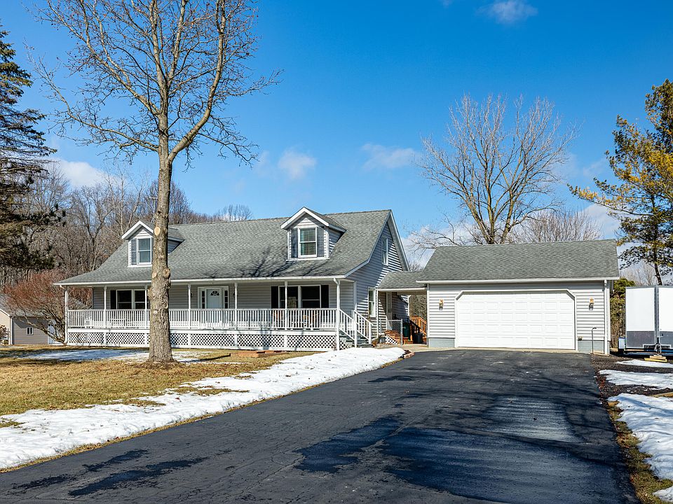 HIGHEST AND BEST DUE MONDAY 5/10 @ 5:00 pm. Beautiful 2.27 acre lot with pond is the setting for this fully remodeled home. A large, covered front porch welcomes you to this 2100 square foot home. New paint, flooring, kitchen, 1/2 bath/laundry, and walk-in primary closet. First-floor primary suite with double granite sinks and walk-in shower. Main level also features a formal living room, family room with wood burning fireplace, entry level laundry, powder room, kitchen with large quartz island, and dining area between the kitchen and family room. Door wall to freshly painted back deck and large picture window overlooking the yard and pond. Upper level has two large family bedrooms and full bath with tub/shower combo. Full basement ready for your finishing touches with your very own pool 2 car garage attached with a breezeway with additional aggregate parking space off main driveway and 3 sheds, 2 with electric. New furnace and water heater in 2021. 200 AMP electrical service. City water. Zoned heating and cooling for all 3 levels. Portable generator that powers the essentials (furnace, fridge, sump pump, quad outlets on stairwell). OPEN HOUSE: SUNDAY 3/2 1:00-3:00