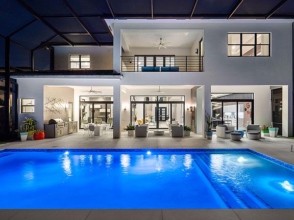 Step into an unparalleled custom contemporary estate in Boca Bridges, where modern elegance meets meticulous design by the renowned Mancini Duffy firm. Every inch of this exquisite home has been thoughtfully curated, featuring luxury finishes imported from Italy and Spain that add depth and sophistication to each space. The grand entrance reveals a sweeping open-concept layout adorned with a custom glass staircase, elegant CavaStone porcelain floors, and striking Sonneman chandeliers that set the tone for this exceptional residence.In the heart of the home, the family room centers around a sleek linear fireplace, effortlessly flowing into the kitchen and dining areas. Natural light fills the space, illuminating the custom Pedini kitchen outfitted with premium Miele integrated appliances, a stunning porcelain-layered island, and Dorn Bracht fixtures. Additional contemporary touchesincluding a custom leather wall unit, drop ceiling details, and bold geometric lightingbring warmth and style to every corner.