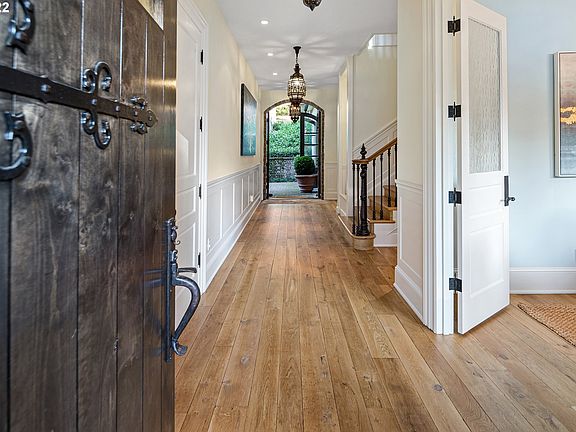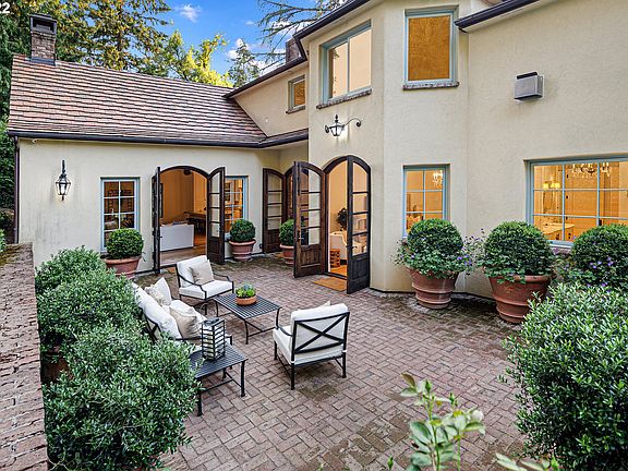 Gorgeous custom design with a European influence transports, inspires & delights in this gracious home with a Santa Barbara style. Stunning details & finishes incl 300-yr-old reclaimed beams from France, reclaimed French oak floors & design elements sourced from around the world create a home that lives and functions brilliantly. Fantastic entertainer's layout with a private brick courtyard patio & lovely garden. Primary suite on main. Forest Hills lake easement. Near Tryon Creek State Park.
