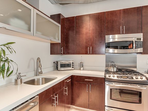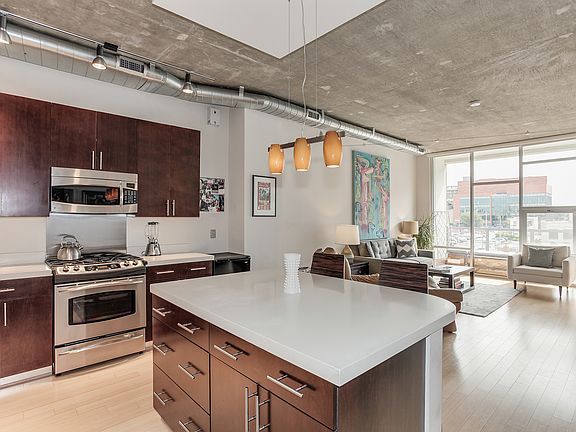 This stunning unit is located in a pet-friendly and well-maintained condo building. Gorgeous hardwood floors flow from the entry to the spacious open-concept kitchen and living room. The kitchen is designed for cooking and entertaining with sleek, white countertops and a complete set of stainless steel GE Profile appliances including a gas range, microwave, dishwasher and refrigerator. A center island, illuminated with beautiful pendent lights, creates additional storage and a convenient dining space. High ceilings allow natural light to flow through out the unit from the wall of windows at the far end of the living room. Electronic floor-to-ceiling shades provide immediate window coverage if desired. A glass door opens to a covered balcony with panoramic views of the city. Complete with wall-to-wall carpeting, this loft-style bedroom includes a large closet. Next to the bedroom sits an immaculate bathroom with tiled floor and a clean, modern design. This condo comes with ample storage. Placed opposite the entry door, the full-size closet provides plentiful space for coats and outdoor gear. A large walk-in closet houses a stacked washer and dryer providing additional storage space.
