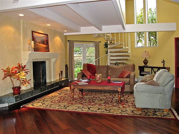 This sunny, architecturally unique, 2500 square foot home features 4 bedrooms, 3 baths, plus a family room/office loft. Located on a level, 7200 square foot lot above Homestead Valley, it is surrounded by beautiful gardens, lawn, and patios, which offer tranquil views from every room. An abundance of French doors, windows and skylights insures a bright, light-filled home year around. A separate art studio/office is connected to a detached, one car garage.