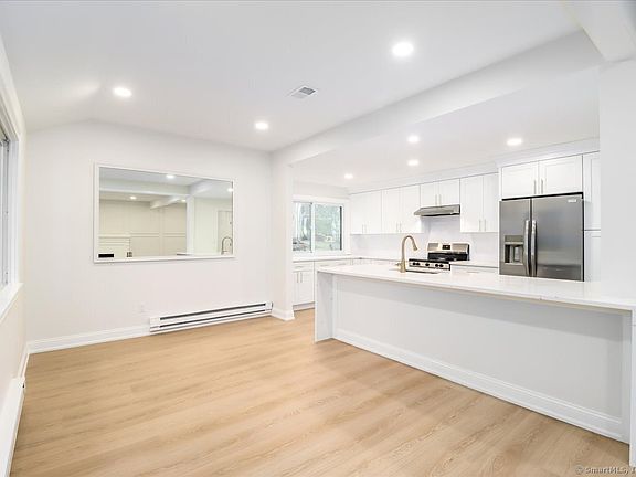 Welcome to Heritage Village, an award-winning 55+ community offering resort-style living with multiple pools, golf, fitness center, tennis and pickleball courts, scenic trails, and countless clubs and activities. This beautifully updated 3-bedroom, 2-bath Berkshire-style end unit blends modern design with comfort. The open layout features 9-ft ceilings, luxury plank flooring, abundant natural light, and a spacious living room with cozy fireplace and accent wall. The redesigned kitchen showcases high-end cabinetry, marble countertops, and stainless appliances. The primary suite is a serene retreat with double closet, spa-like bath with walk-in tiled shower, and a custom accent wall. Two additional bedrooms provide space for guests, office, or den. Outdoor living is inviting with extended patios and private gardens where you'll enjoy light from the sunrise in the mornings and glowing sunsets in the evenings. Notable upgrades include new windows (except baths), fresh wallpaper, solid wood doors, recessed lighting, custom trim, and designer finishes. The heat pump is only 2 years old, offering efficient year-round comfort. An oversized garage and storage room add convenience. Ideally located in the desirable Hilltop area-walkable, near pickleball, and close to one of the best pools-this home offers both luxury and community, just minutes to shopping, dining, cultural attractions, major highways, NYC, Boston, and the CT shoreline.