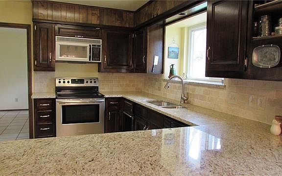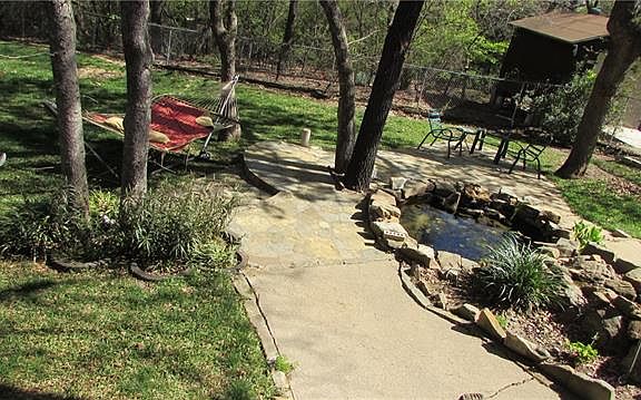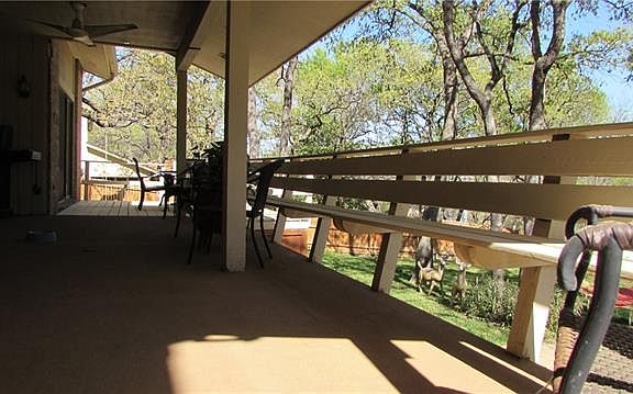 Located at the end of a quiet street in Woodhaven Country Club Estates, backs up to wooded area, nice curb appeal with tile roof and rear entry garage, relax and entertain out on the large wood deck overlooking the koi pond and treed yard, granite counters and SS appliances including an under the counter beverage cooler, spacious living with raised ceilings and a beautiful natural stone wood burning fireplace, downstairs master with glass doors that access the patio deck, updated vinyl windows, large storage shed. Amazing wood look tile, a real farm house feel.