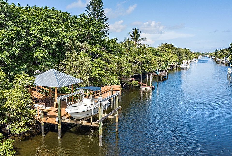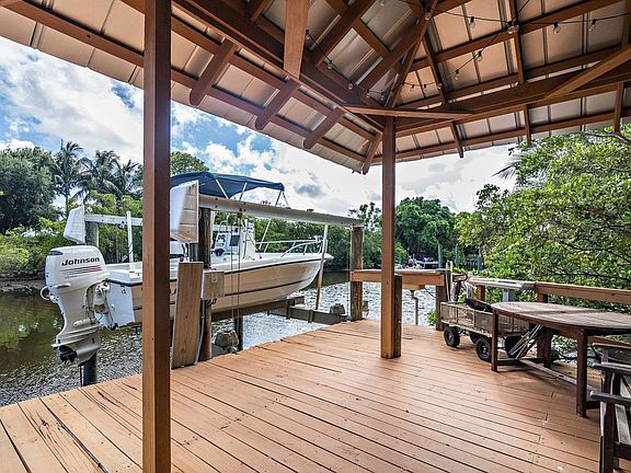 Spectacular Secluded Paradise describes this custom home. Featuring a New Tiki Hut with electric, a 55ft dock with water, electric & 12,000lb Boat-lift and a covered dock A Gorgeous Custom salt water heated pool with jacuzzi surrounded by an enormous brick paver patio that you will entertain and enjoy surrounded by a serene Tropical landscape. Some other features of this home have wood & laminate floors, granite kit counters, S/S appliances. New master bath & A/C replaced 2015.Enjoy swimming in a Gorgeous salt water heated Pool w/Jacuzzi. This home is a hidden ''Gem'' You will not be disappointed. If you like outdoor entertaining, boating, and No Homeowners association, This is a place you will feel like you're on vacation every time you come home. SFWD EASEMENT BEHIND LOT LEADS TO DOCK