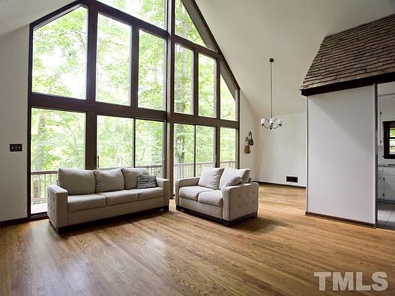 Great Cary Location with an abundance of Privacy. Panoramic Forest views out of the Towering floor to ceiling windows make this A-frame feel like a Cabin in the Mountains. However, it is conveniently close to I 40 & I 440. Mature landscaping make for a Gorgeous setting while walking around the Neighborhood. Especially in the Fall & Spring. Open Floor Plan, Hardwood Floors, Finished Basement add to the Charm of this home. Updates include tankless water heater (2013), furnace, a/c (2011), roof (2015).