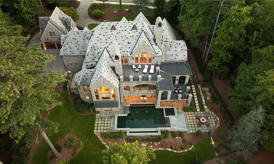 “The Castle” at The River Club" Welcome to The Castle, an extraordinary full-limestone Italian estate where timeless architecture and modern luxury converge. Built with craftsmanship seldom found today, every detail speaks of artistry and purpose—from the rich heart Rocky Mountain pine flooring to the custom, chosen for both beauty and lasting quality. Privately situated in one of The River Club’s premier locations, the property captures panoramic views of the 8th hole and shimmering lake. These vistas surround the home, visible from the fireside keeping room, covered outdoor terraces, and the showstopping double infinity-edge pool where water meets horizon. The main floor offers elegant formality and comfortable warmth. The fireside great room, formal dining room, and leather-paneled study exude refinement, while the gourmet kitchen with stone fireplace keeping room invites casual gathering. A breakfast room, artistic two-way walk-in pantry, and guest suite with a steam shower bath complete this level. Upstairs, the owner’s suite is a truly Italian-style masterpiece—a sanctuary with a fireplace, coffee bar, private terrace, and intimate loft accessed by its own spiral staircase. The spa bath is crowned by a hand-painted domed ceiling with cherubs, a crystal chandelier above a black soaking tub, floor-to-ceiling stone, heated floors, steam shower, and dual private water closets. The expansive walk-in closet recalls a bespoke European atelier, complete with hidden cedar closet and dressing mirrors. Three additional bedrooms each have distinct personalities: a luxurious cabin retreat with mural, hardwood planks, and metal ceiling; a princess suite in soft purples with hand-painted art; and a sunlit sanctuary in serene tones. The indoor staircase to the terrace level is finished with plush carpet and a hardwood handrail, while outside, a graceful spiral staircase connects the upper terrace to the pool level. The terrace level is an entertainer’s haven—a full Irish pub, billiards room with brick flooring, media room with movie theater screen, home gym, steam/dry saunas, and space for a massage area. Another guest suite offers privacy, with decks leading to the pool and outdoor entertaining areas. The property features a two-car attached garage and a two-car detached garage. Above the detached garage, a private retreat awaits—ideal for a golf simulator, gaming, music studio, hobby space, or the ultimate man-cave. Both garages have carriage-style cedar doors and are joined by a paver driveway that adds timeless curb appeal. From coffee on the enclosed porch to starlit evenings on the terrace, The Castle is more than a home—it’s a lifestyle of elegance, craftsmanship, and enduring sophistication.