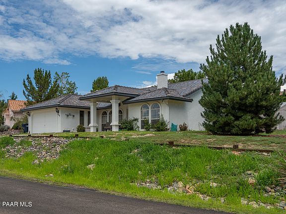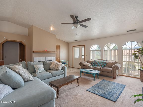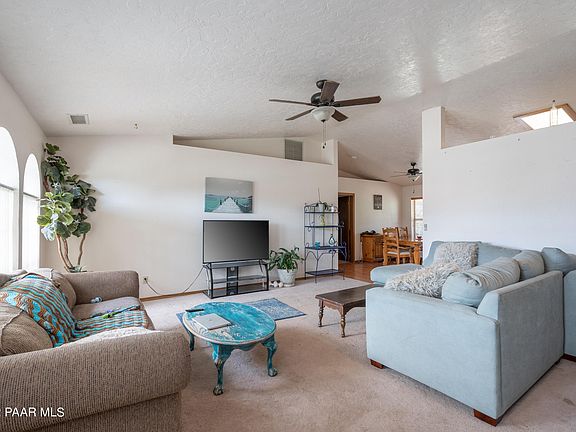 Wonderful open floor plan with split bedroom design, gas log fireplace, eat-in kitchen and large dining area. The master suite features a large walk-in closet, ensuite bath with separate shower and soaking tub. There is a private back patio and Bradshaw Mountain Views out the front patio. There is a large side yard and a tile roof.