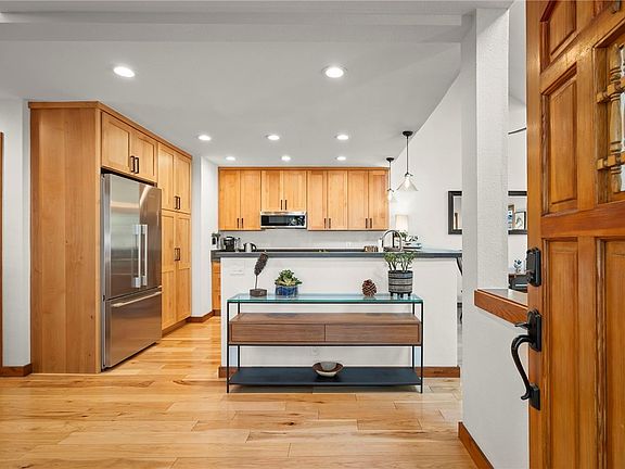 The updated kitchen is equipped with stainless steel appliances, Quartz countertops, Alder cabinets, and a convenient breakfast bar—ideal for casual meals or social gatherings.